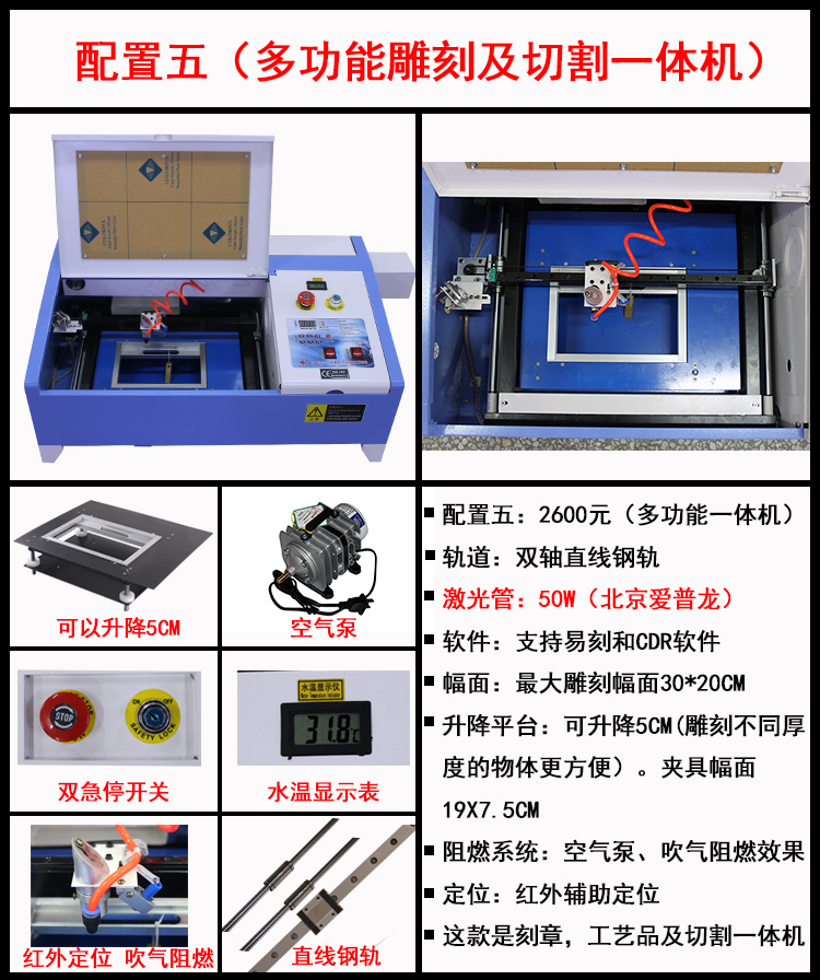 愛普龍配置五: 30*20厘米雕刻幅面,采用雙軸直線軸承,橫向采用直線鋼軌方軌軌道,帶紅外定位,吹氣阻燃,電磁氣泵,升降夾具平臺,蜂窩平臺,支持CDR軟件直接雕刻,切割,速度快,雕刻耐磨損。采用北京愛普龍50W激光管。價格:2600元