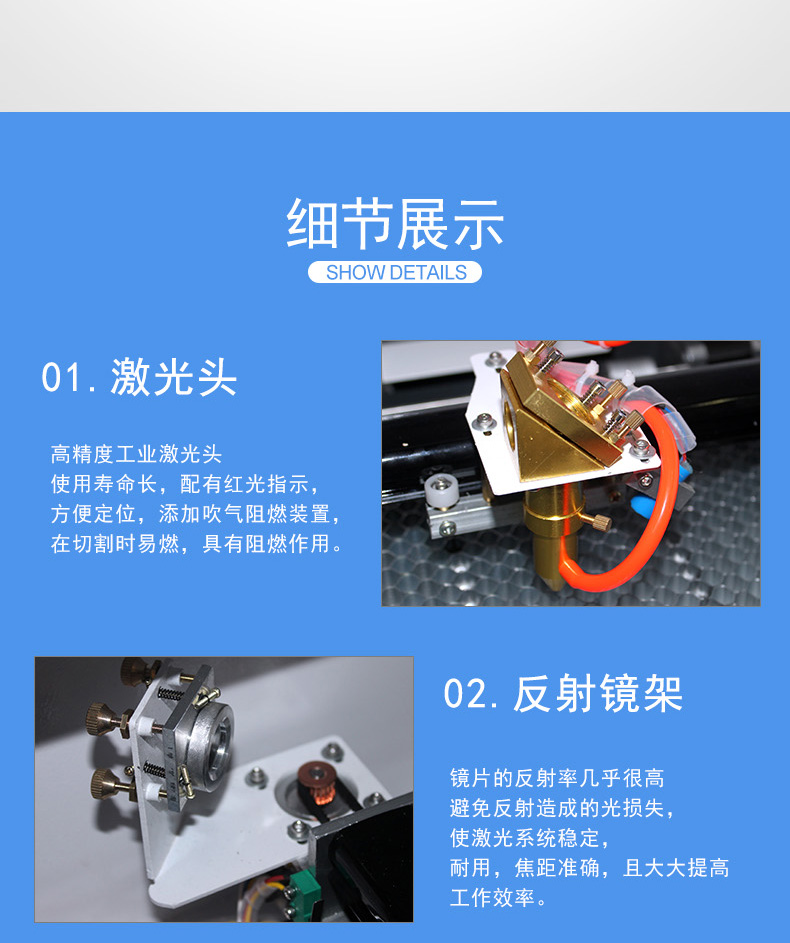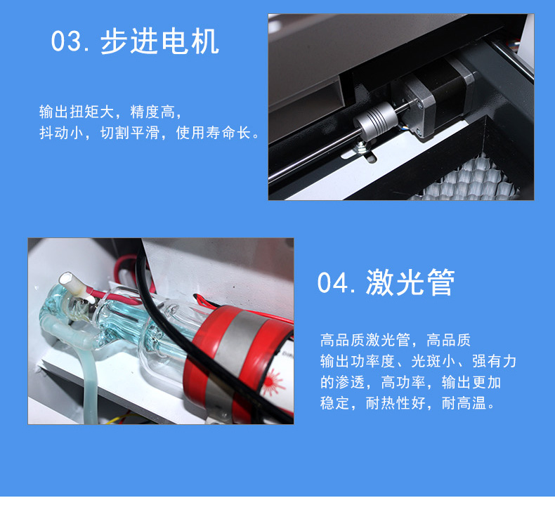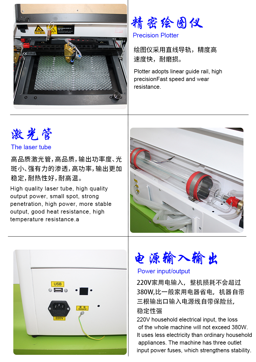 新式60W: 60W激光管(專業(yè)定做用于這種小型)智能顯示屏(有智能排除故障參考功能, 電源或是激光管壞了上面會有相關(guān)的顯示)、內(nèi)置手動升降裝置、吹氣阻燃、直線高速導(dǎo)軌(速度快、精度高)+工業(yè)級鑰匙加密+急停止開關(guān)+水溫監(jiān)測系統(tǒng)(可以隨時檢測循環(huán)水溫度)、專業(yè)出口激光電源(定制用于出口的激光電源)、采用M2板卡(支持CoreLaser、CDR直接輸轉(zhuǎn)換輸出,),工業(yè)級激光頭、紅光定位系統(tǒng) 、雙坦克式導(dǎo)鏈裝置+金屬反光鏡片、導(dǎo)軌采用高速直線方軌。